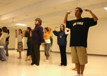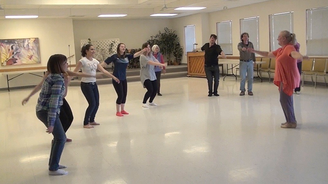 The Elizabethan Dance workshop is a two day workout during which students are introduced to courtly dances like Ballo Fatto (translated, the ‘done’ dance), the lively country dances from plays like Much Ado About Nothing and play-specific dances like The Wild Witches’ Dance from Macbeth. We are fortunate to have Elizabethan Dance specialist, Catherine Lee, to lead the workshop. Catherine is Artistic Director of the Greater Vancouver Historical Performance Society of BC. Students are introduced to the steps, rhythms and shapes of Renaissance dance, from the intricate steps to the elegant bows and gestures. Photo above shows Catherine Lee (far right) leading a workshop.